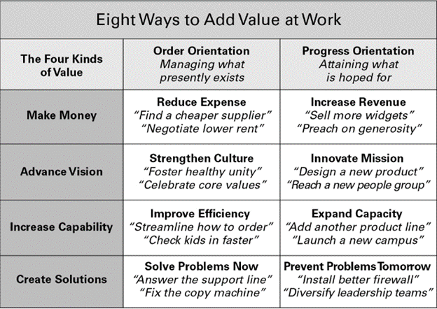 How is your purpose adding value? In the book Younique, Will Mancini provides a great framework you can use to assess the value you provide in the expression of your purpose. While he is specifically addressing adding value at work, the framework can be used beyond the workplace. Your purpose should cause progress or order. [2]